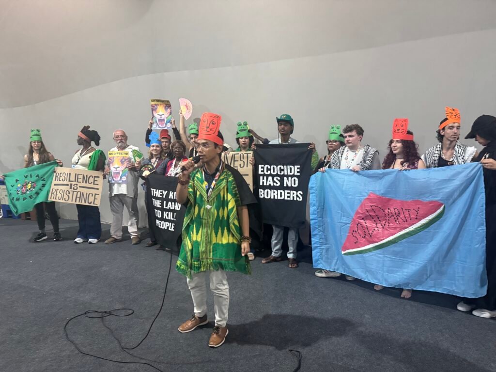 “Lamentablemente no tenemos poder de decisión, pero estamos presentes porque sabemos la urgencia del problema y vemos que el sistema actual está implosionando y a su paso destruyendo el planeta y destruyéndonos a nosotros”, dice Bryan Bixcul, de la comunidad Maya-Tz’utujil de Guatemala y coordinador global de la coalición SIRGE, una plataforma liderada por indígenas para que ejerciten su derecho al consentimiento previo, libre e informado.