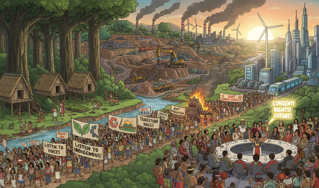 Esto se incluye en el numeral 12, que también reconoce la importancia del consentimiento previo, libre e informado, y especifica que todos los caminos que lleven a una transición energética justa deben respetar los derechos individuales y colectivos de los pueblos indígenas.
