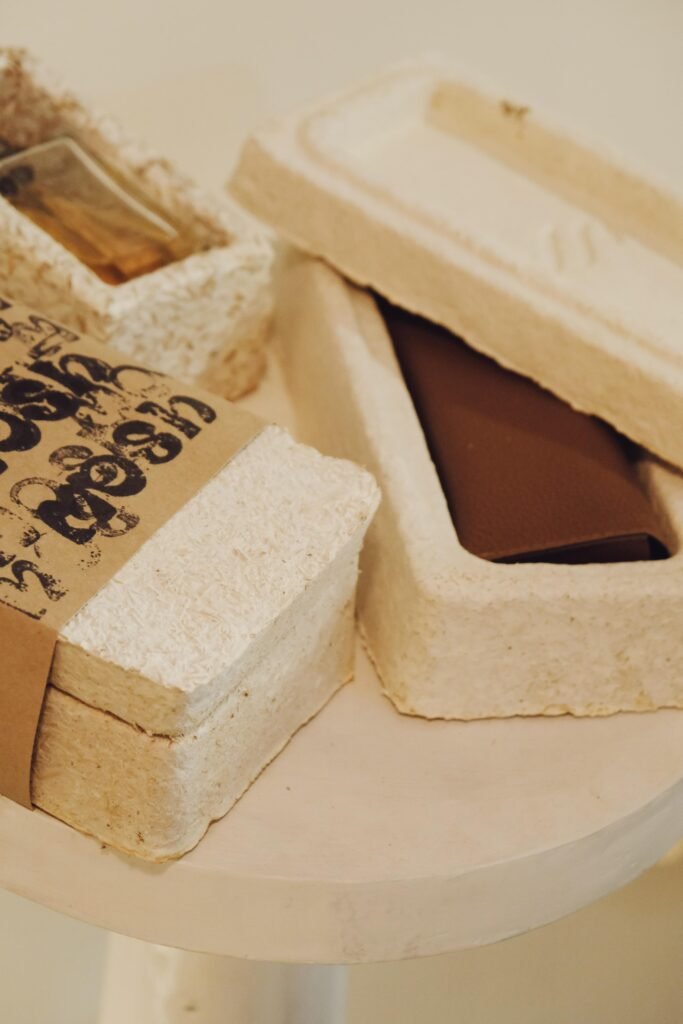 El proceso detrás del material es tan innovador como orgánico. El micelio se alimenta de residuos agrícolas reciclados, provenientes de productores locales. Esta mezcla se coloca en moldes, donde —bajo condiciones controladas— el hongo crece hasta formar una matriz firme y completamente biodegradable.