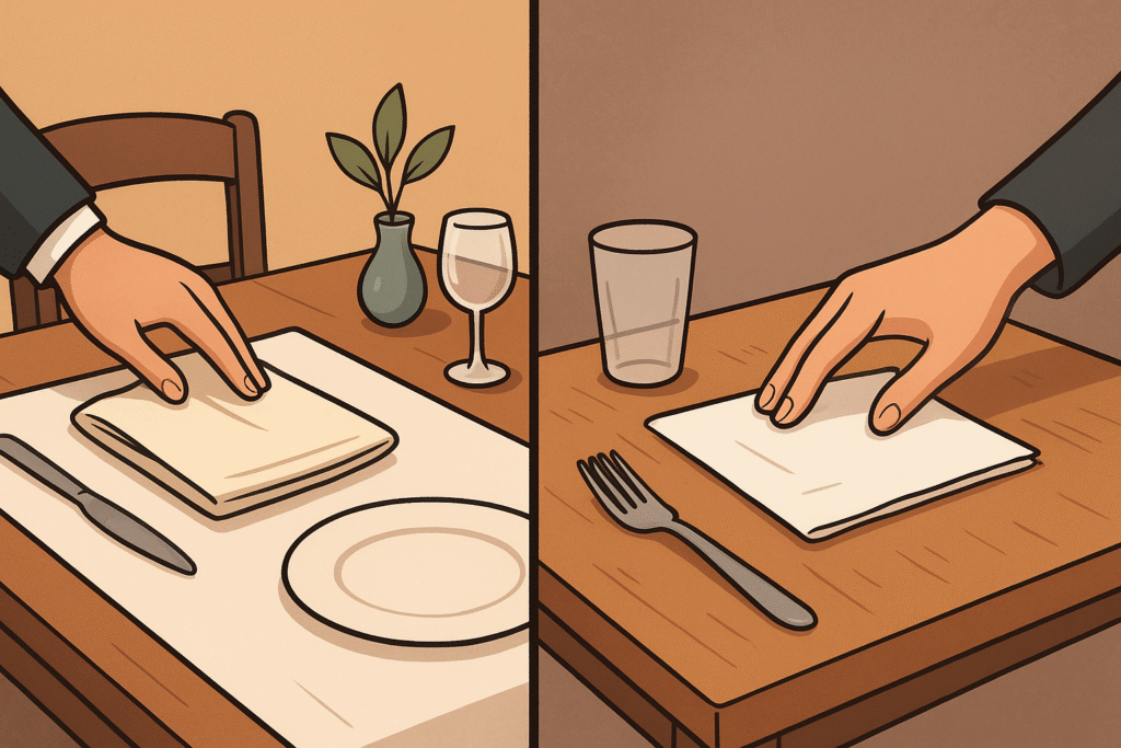 En el fondo, la servilleta no es un simple accesorio: expresa una forma de entender la hospitalidad. Una mesa con tela invita a permanecer, a disfrutar con pausa. Una servilleta descartable, en cambio, sugiere rapidez, practicidad, rotación de mesas. La estética del detalle convive entonces con la lógica del “usar y tirar”.
